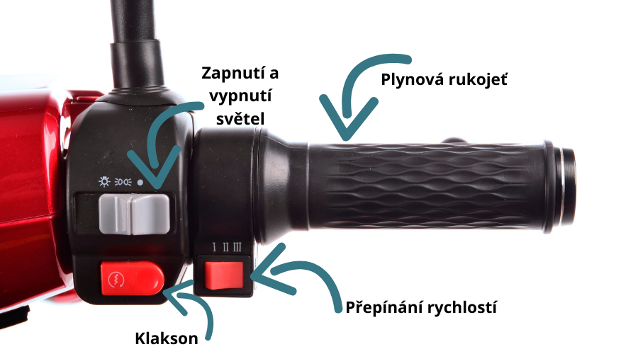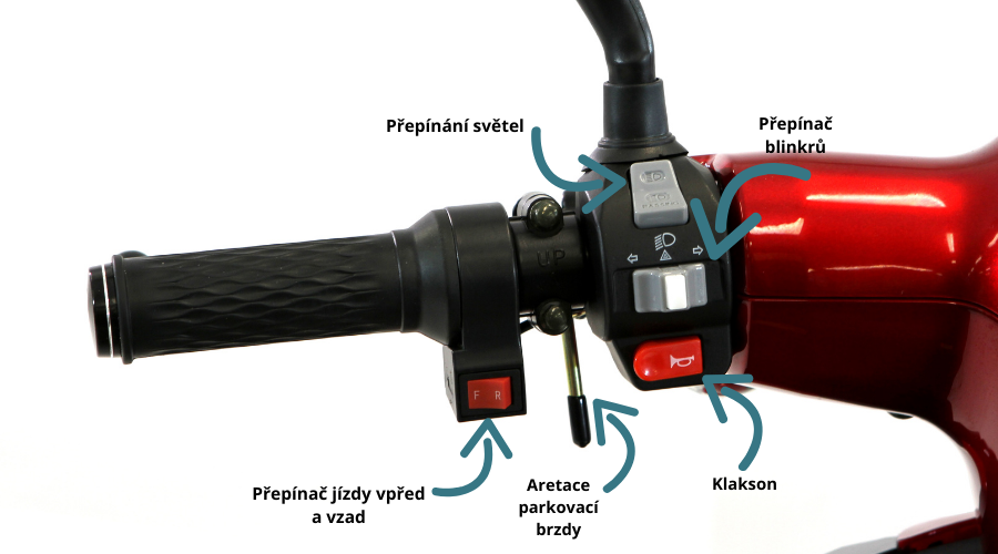 Na obrázku níže vidíte jednotlivé ovládací prvky vozíku Selvo.